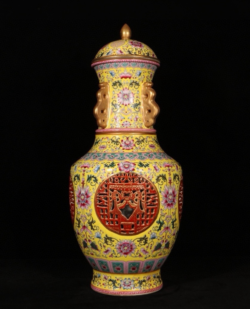 - 珍しい 清時代 乾隆年製 粉彩黄地 転道絡枝蓮 透かし転心瓶 古陶磁器 陶芸 中国陶瓷器 置物擺件 古美術品 古賞物 旧家蔵出 中国唐物 820