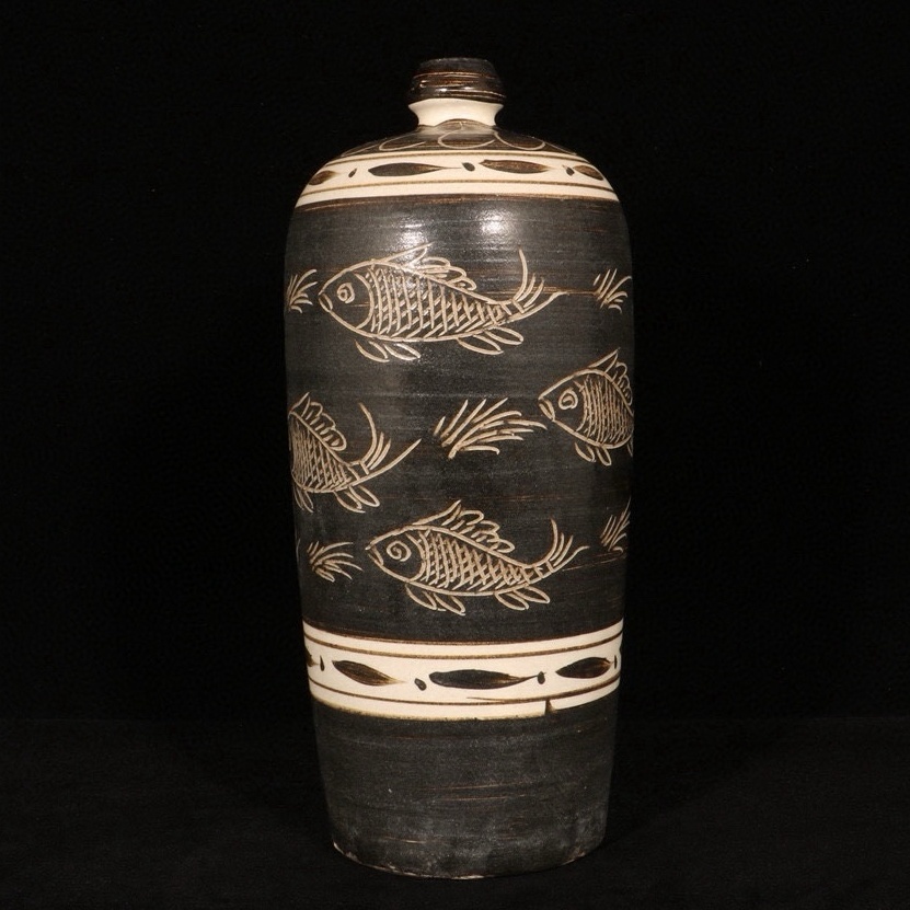 - 中国宋代 磁州窯の 手作り胚 九魚梅瓶 時代物 陶磁器 中国美術 高さ27.5 cm 直径12 cm 骨董品 唐物 820