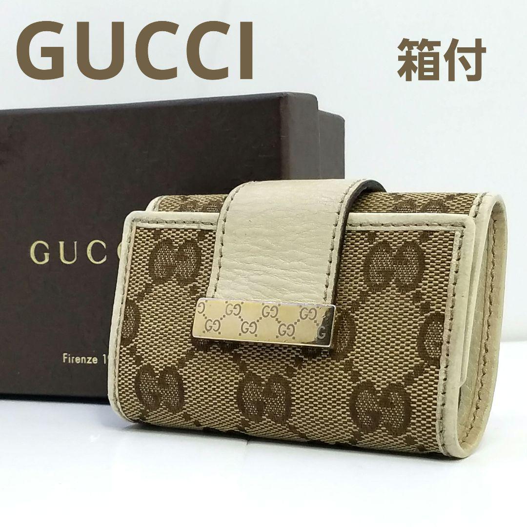 - 送料無料 GUCCI 箱付 グッチ 6連 キーケース GGキャンバス シマ プレート レザー 212098・0416 ベージュ オフホワイト イタリア製