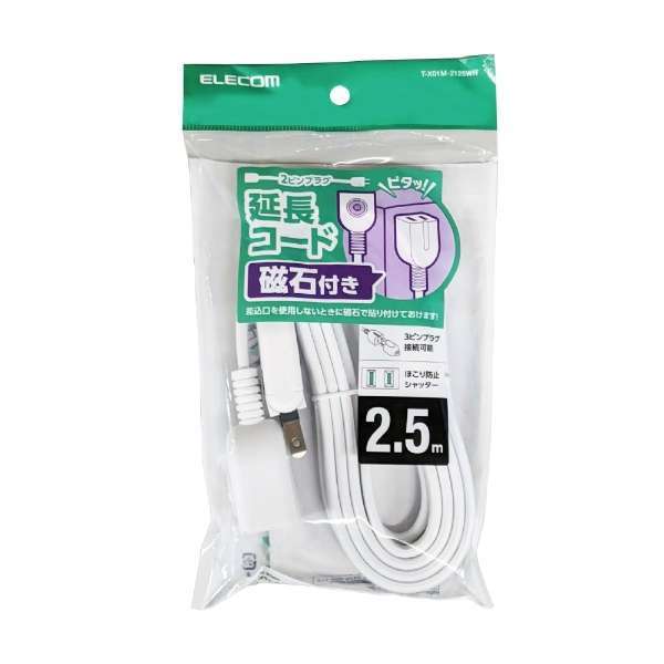 - マグネット付き電源延長コード 2.5m 本体底面にマグネットを配し、スチール製の家具などに貼り付けておけます: T-X01M-2125WH