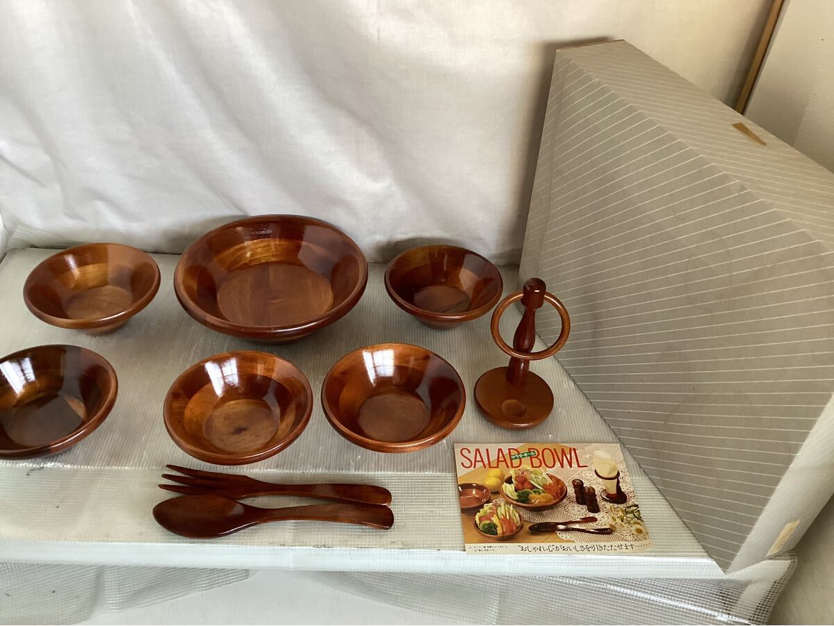 > 【K0610】サラダボール セット 大鉢 中鉢 スプーン フォーク マヨネーズ立て 合成漆器 ウレタン塗装 素地天然木 箱入り未使用