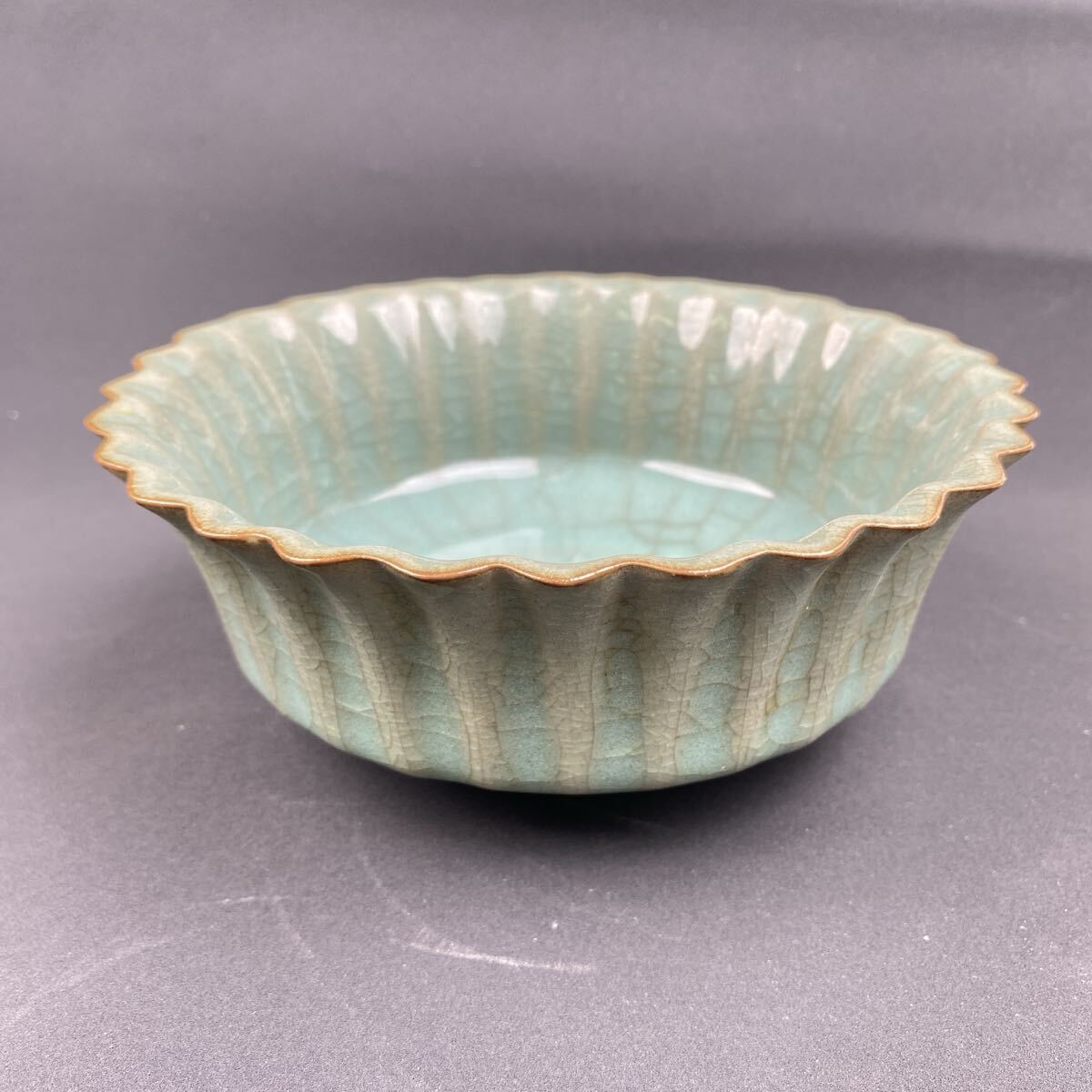 - 古美術 骨董 青磁 花口鉢 茶道具 青瓷 碗 開片紋 唐物写 官窯風 龍泉窯様 古陶磁 手造り 陶芸作品 時代物 茶器 侘び寂び風 中国陶磁