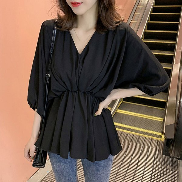 - シャツ Vネックブラウス 着やせパフスリーブ シャツ無地 ボリュームスリーブ ゆったり シャツ白 通勤おしゃれ七分袖