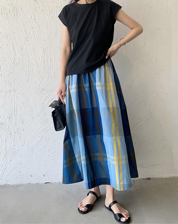 - ブルー / 秋新品 ロング丈 チェック柄 フレアスカート 着やせ レディース Aラインスカート マキシ丈 ボトムス 大人 通勤 通学/12色選ぶ