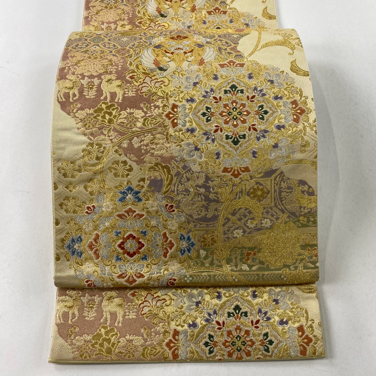 > 袋帯 美品 秀品 華文 花唐草 金銀糸 箔 ベージュ 六通 正絹 【中古】