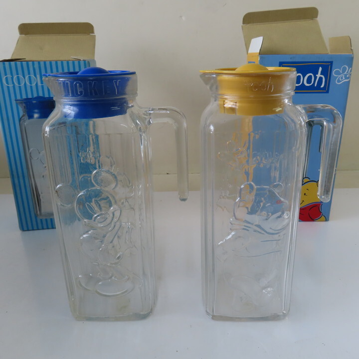 > ●●佐⑨1 ディズニー ガラスポット 2個 麦茶ポット 茶器 ウォータージャー ジャー ぷーさん ミッキー セット 日本製 保管品 未使用