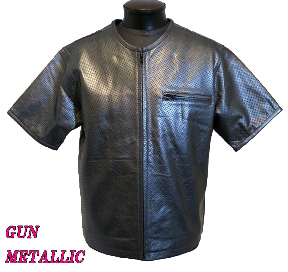 > Lサイズ 夏のライダース 牛革パンチングレザー シャツ メッシュ裏地 3698 ガンメタリック 本革 半袖 サマージャケット メッシュレザー