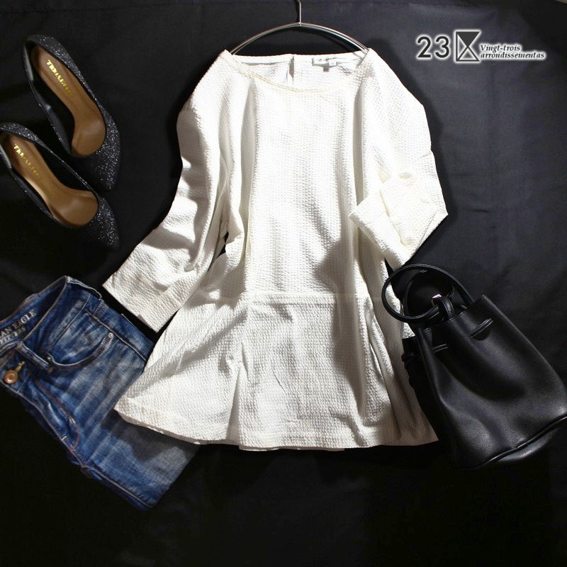 > 美品 23区 株) オンワード樫山 春 夏 ぷくぷく ワッフル ストレッチ ジャージ― 七分袖 カットソー 9号 38 ホワイト 白