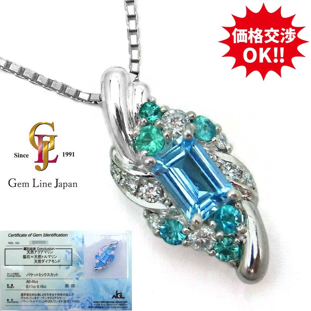 > アクアマリン 0.48ct ダイヤモンド 0.17ct トルマリン 0.18ct プラチナ ネックレス NGLソーティング付