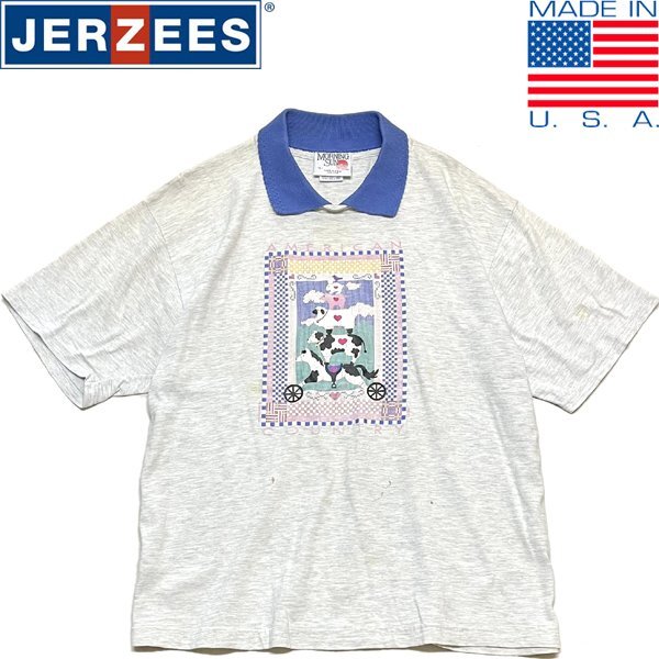 - 1点物◆USA製ジャージーズ90sビンテージ襟付プリントTシャツ古着メンズLレディースOKアメカジ90sストリートスポーツアメリカ製グレー349712
