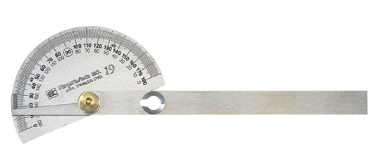 仕様:目量:1°・最大測定角度:180°・精度:±20′・本体:直径90mm×厚1.2mm・竿:全長204mm×厚1.2mm
