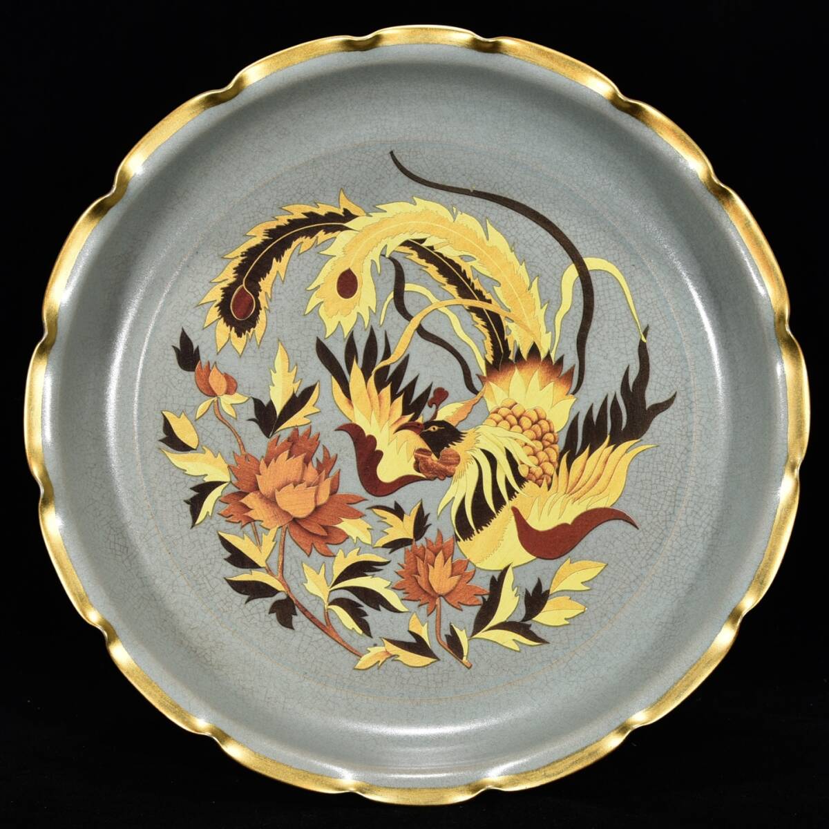 - 旧蔵 宋 汝窯 包口絵彩鳳凰戯牡丹紋皿 陶芸 古陶磁器 中国磁器 極細工 中国古玩 骨董品 古美味 208