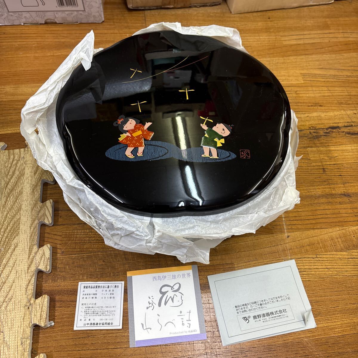- A8-49【未使用】山中漆器 梅型 オードブル お重 重箱 2段重 西島伊三雄 わらべ詩 童 竹とんぼ 箸付き