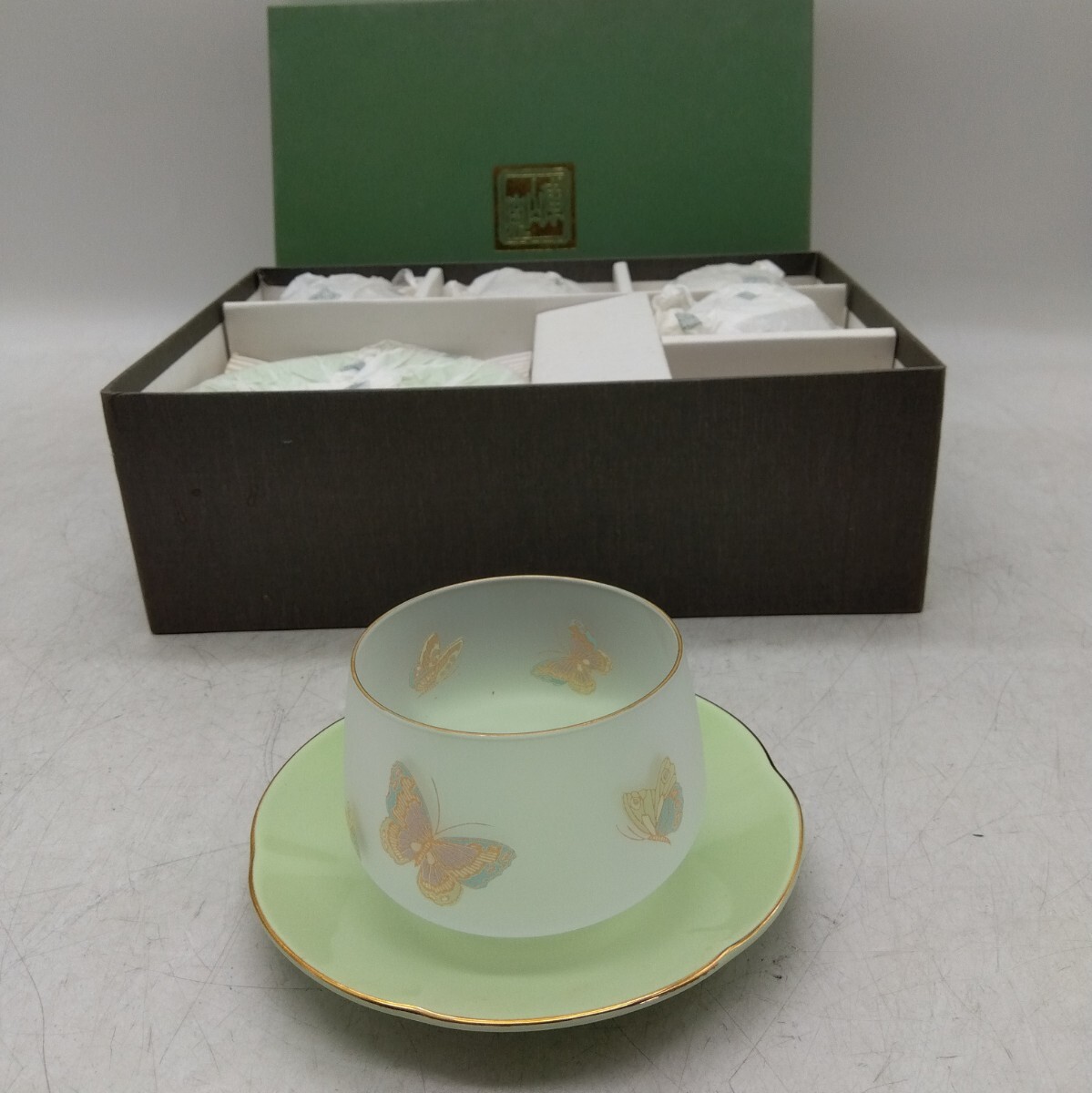 > 【保管品】庫山窯 美濃 前畑陶器 色絵蝶 冷茶椀揃 金縁 緑色 茶托 冷茶グラス 5客セット 蝶々柄 茶器セット 和食器 プレート 皿 DM0826O