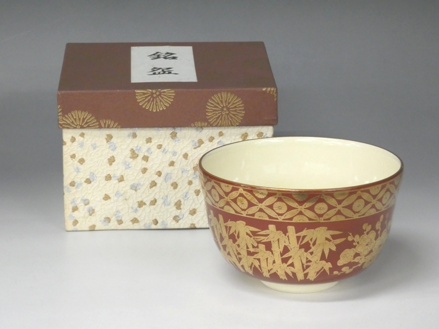- S578Sちょる 【茶道具名品】宮地英香造 茶碗 松竹梅 紅地 金彩 化粧箱 茶席 金蘭豪華茶碗 茶道家収集品 状態良好品 時代出物