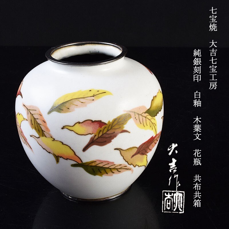 - 七宝焼 大吉七宝工房 純銀刻印 白釉 木葉文 花瓶 共布共箱 SYXA