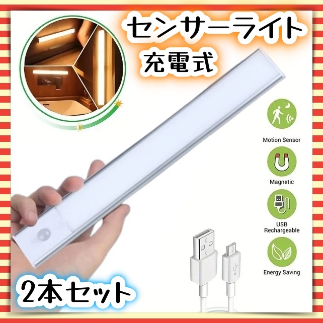 - 2本セット LED 人感 センサーライト 充電式 調光 自動 点灯 消灯 足元 手元 玄関 階段 トイレ 廊下 取付簡単 マグネット 感知 配線不要