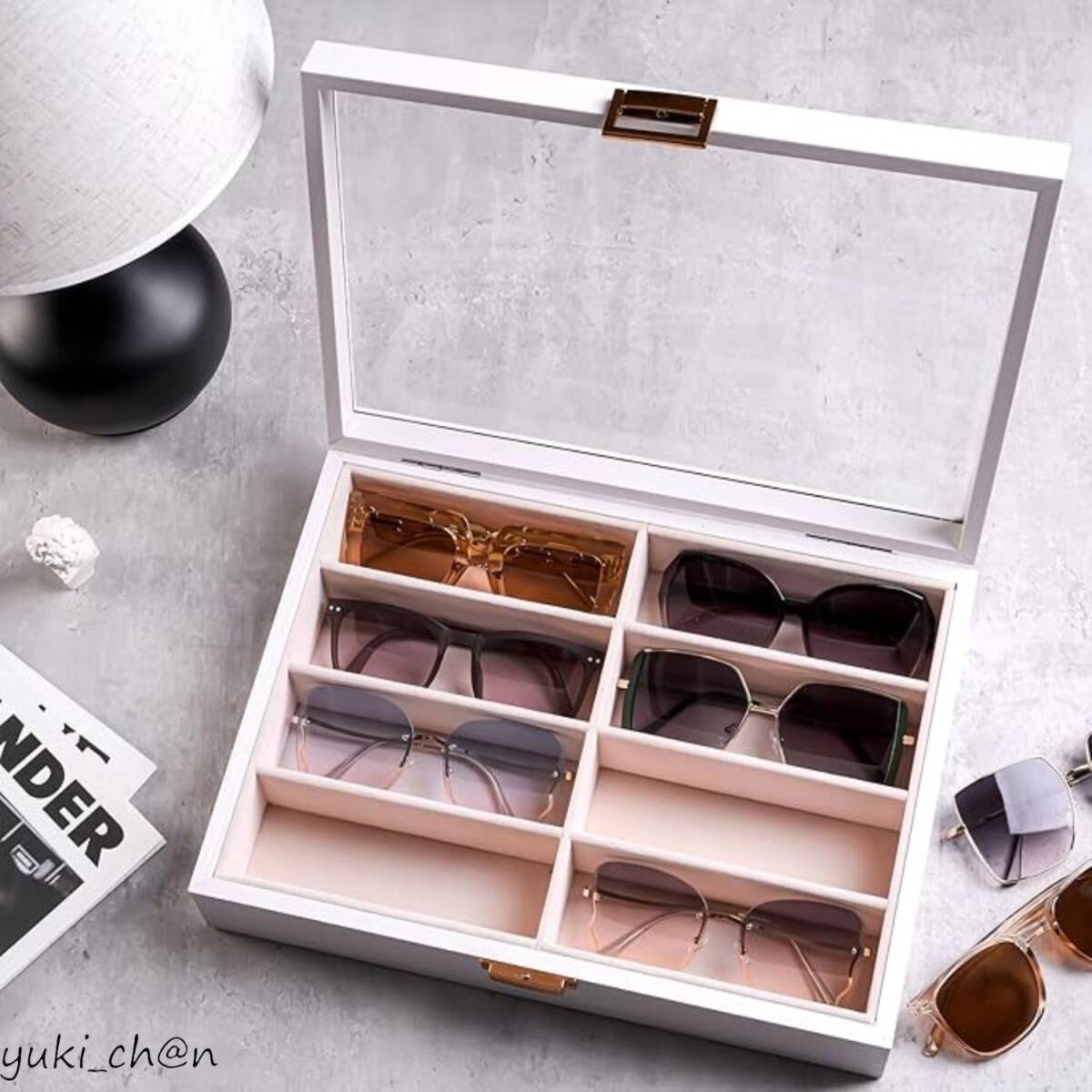 - サングラスケース メガネ・アクセサリー収納ボックス 眼鏡・ジュエリ管理コレクションケース 8本用 ホワイト 木目 アクリル蓋 PU素材