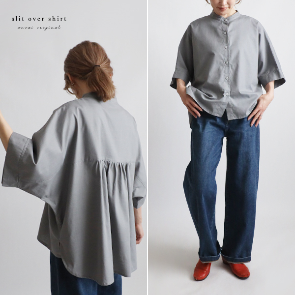 - 上質ギマ擬麻コットン後ろ姿で魅せる 背中ギャザー ポンチョ袖ドルマン オーバーシャツ燕尾裾 着物 羽織り グレー F16A