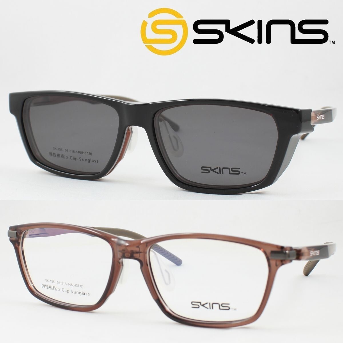 - SKINS スキンズ メガネフレーム SK-156-3 脱着式 マグネットクリップ偏光サングラス 度付き対応 近視 老眼鏡 遠近両用 スポーツ軽量 フード