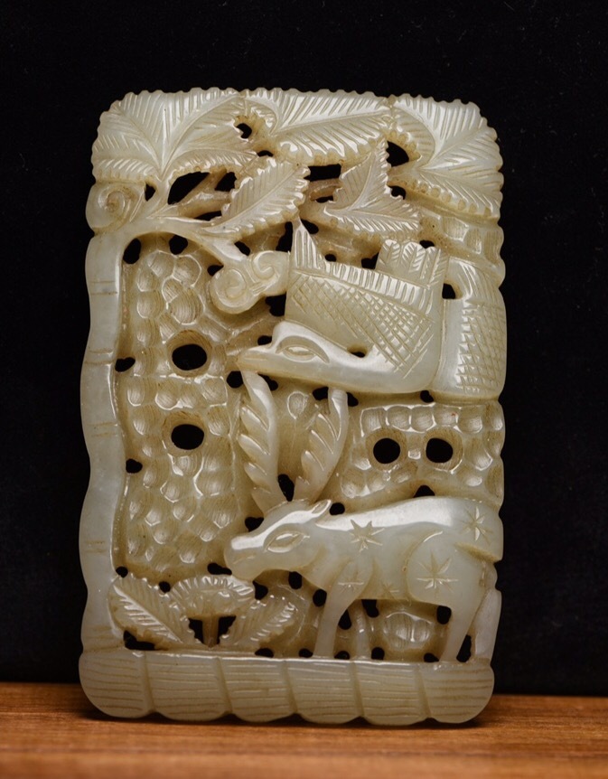- ▽鴻▽ 和田玉製 細密彫 鹿鶴同春 置物 賞物 古賞物 古董品 時代物 稀少珍品 中国古玩 中国古美術