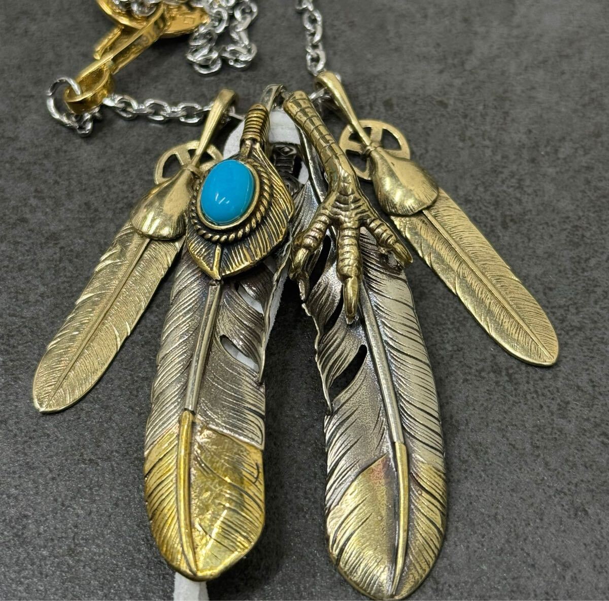 - 高品質 4連 フェザーネックレス 金爪 先金 フェザー ターコイズフェザー 金フック イーグルセット