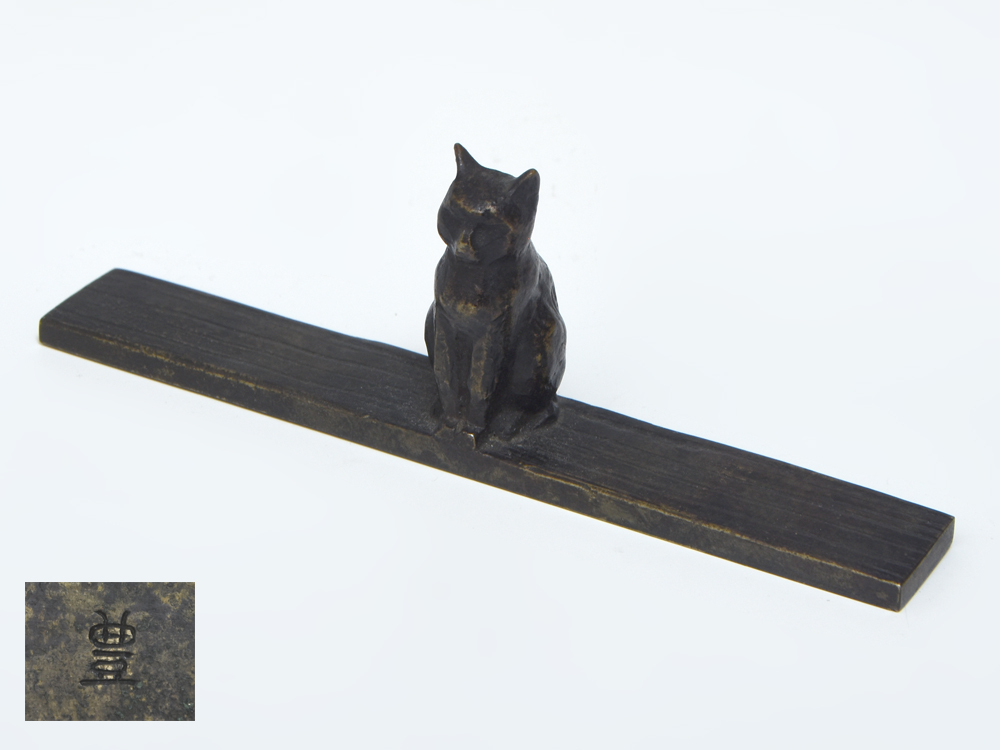 - 豊(作)猫文鎮 ブロンズ 金属工芸 書道具 文房道具 在銘 u0884o