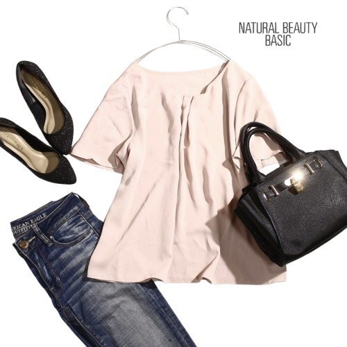> 美品 ナチュラルビューティーベーシック NATURAL BEAUTY BASIC 夏 シフォンカットソー M 薄 ピンク ベージュ ブラウス オフィス 通勤 上品