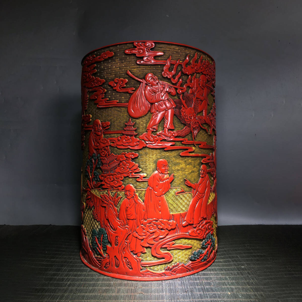 > 8+GV7463「東洋美術」 中国骨董 人間国宝 磁器製品【塗漆器 十八羅漢図 筆立て飾り】 旧物 孤品 珍品 陶磁器 収蔵価値が高い
