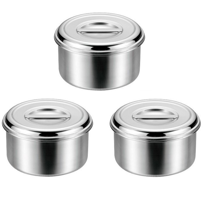 - ★キッチンポット浅型10cm(容量約0.5L)3個引掛金具付蓋の置き場に困らない引掛金具付の蓋ですステンレス18-8日本製新品