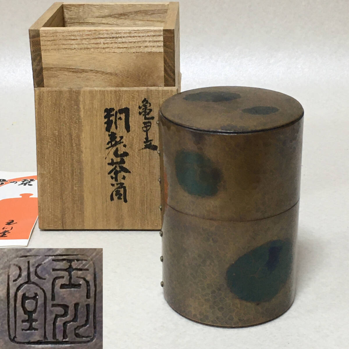 - E496 玉川堂 亀甲文 銅製 茶筒 鎚起 鋲打銅器 共箱 黄布 茶器 茶道具 茶入