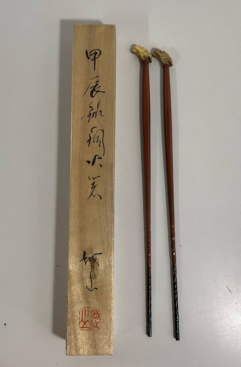 - 茶道具 甲度鍍金火箸 共箱入り 越山作 茶器 龍頭 飾火箸 未使用品