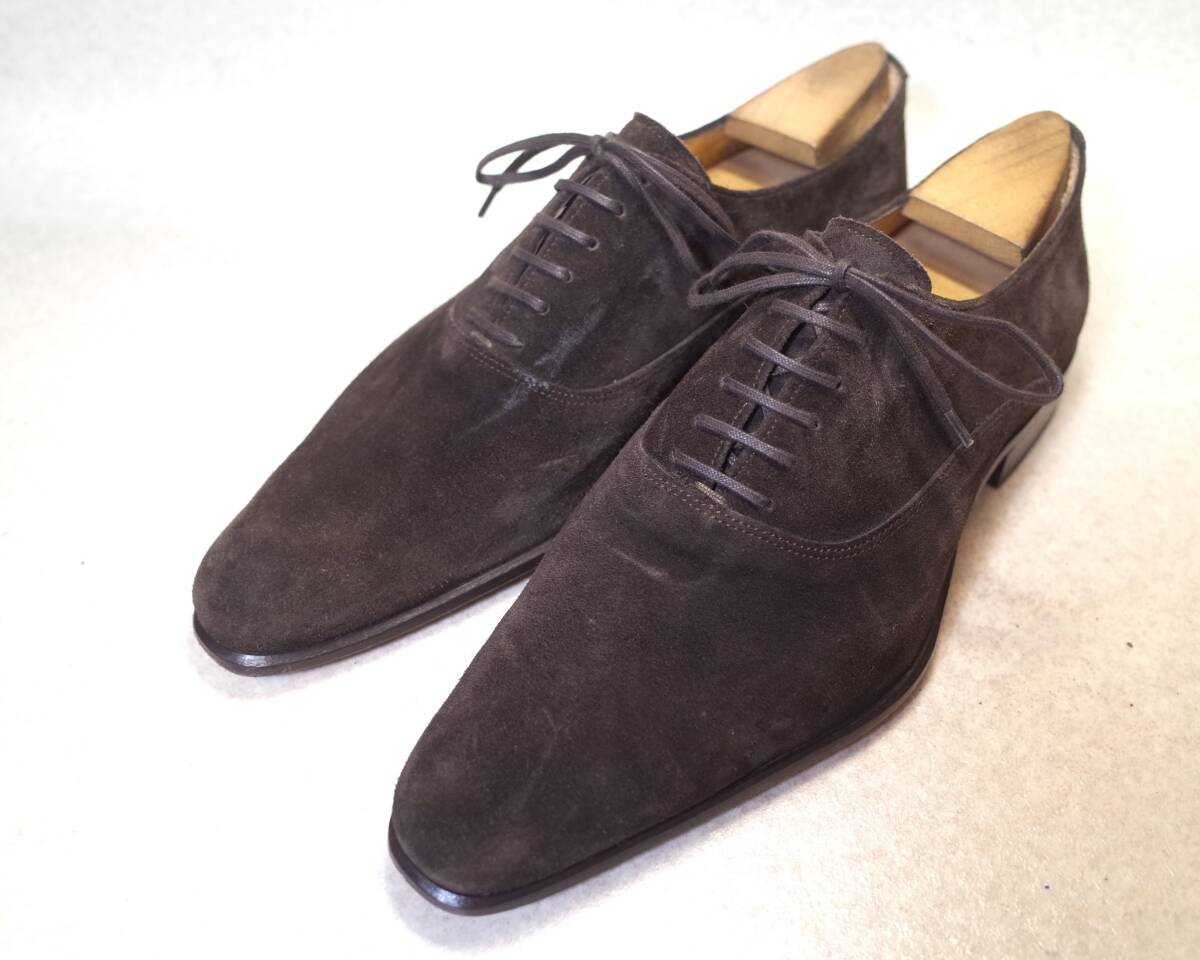 スエードレザーアッパー 内羽根6アイレット ロングノーズ プレーントゥ。