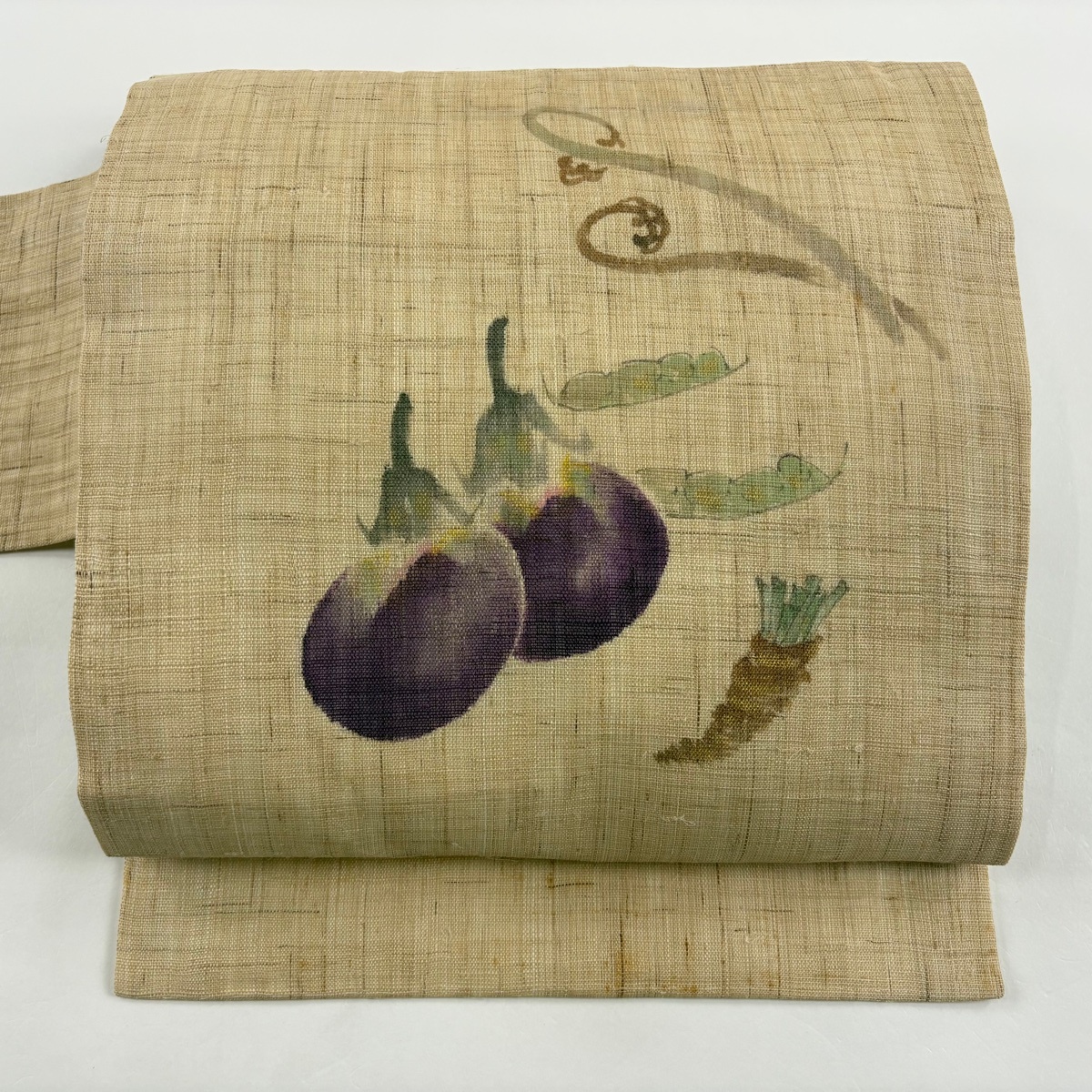 - 名古屋帯 秀品 落款 夏帯 茄子 わらび 金彩 薄茶色 麻 【中古】