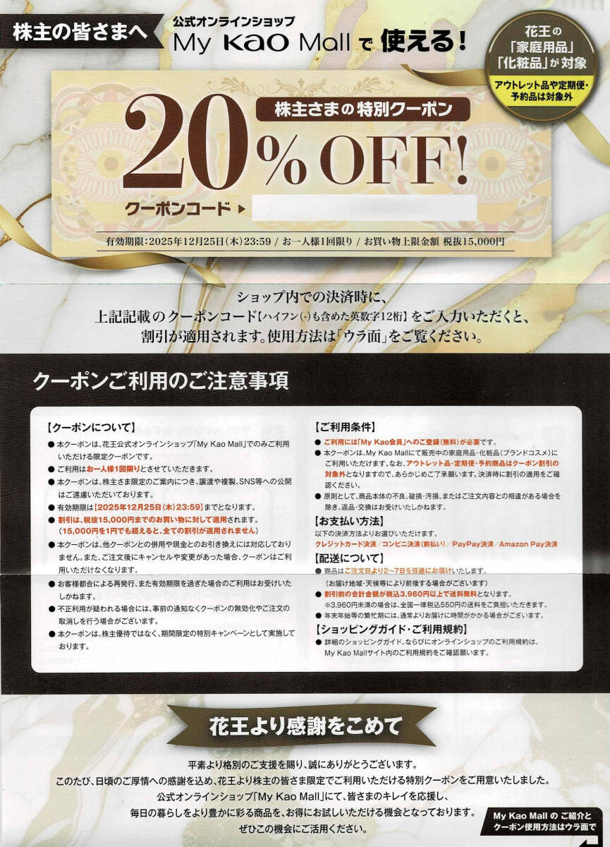 - 即決200円 送料込み 花王株主優待 家庭用品 化粧品 20%割引クーポン