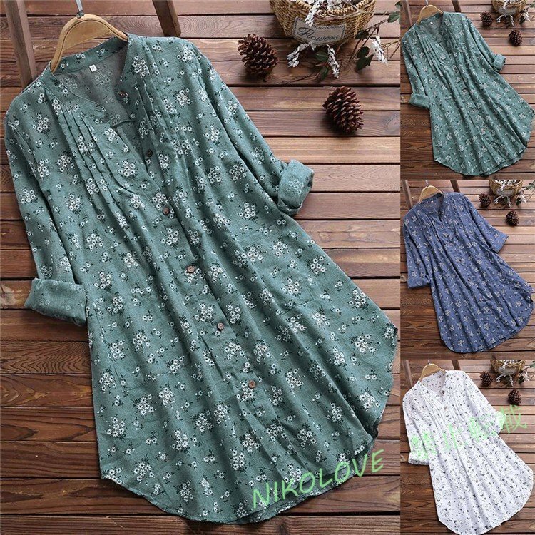 - 新品 シャツワンピース チュニック 春 ブラウス シャツ 長袖 レディース 綿麻混 プルオーバー ブラウス 夏 ゆったり 花柄 可愛いM-XL