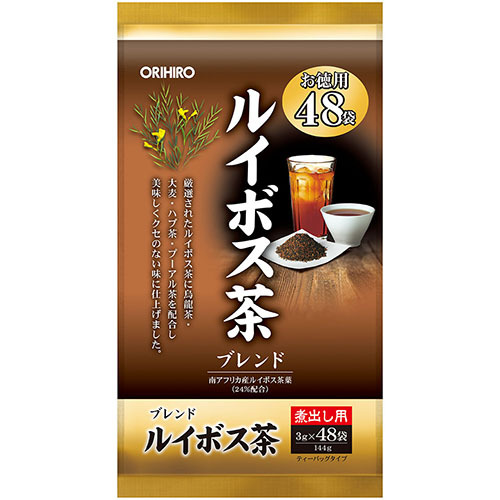 〇注意事項・送料750円が販売価格に含まれています・お取り寄せ商品です。弊社にて手配後、メーカー・卸業者からの直送になります。・まれにメーカー欠品、出荷遅延等が発生致します。問題発生時は別途メールにてご連絡致します。・配送方法の指定、日時指定、置き配、ギフト対応、他商品との同梱配送などは対応できません。・まとめ買いや複数購入の場合は通常より発送に時間が掛かる場合がございます・複数個口の場合、2階以上への搬入ができない場合があります。(その場合は1階での受け渡しとなります)・大型連休、お盆、年末年始などは発送をお休みさせていただく場合がございます・メーカー都合により、パッケージは予告なく変更される場合がございます・梱包用のダンボールはリサイクル品を使用させていただきます。・注文に関するご連絡(注文確定通知・発送通知など)はメールでご案内させていただきます※商品ページの内容について、少しでもご不明な点などがございましたら購入前に一度ご連絡ください〇商品説明【リニューアル・新】徳用茶リニューアル60包48包1)南アフリカ産ルイボス茶葉使用南アフリカ産の厳選された茶葉を24%配合したブレンド茶です。2)独自のブレンドでクセのないすっきりとした美味しさに仕上げました。烏龍茶、大麦、ハブ茶、プーアル茶を配合し美味しく仕上げました。お食事のお供や毎日の健康茶としてご利用いただけます。3)安心の残留農薬323種類検査済み4)たっぷりお得な48袋入り毎日気軽にお飲みいただける48袋入りです。5)16袋×3小分け包装してありますので、開封後も最後まで美味しくお飲みいただけます。本品は厳選されたルイボス茶葉に烏龍茶、大麦、ハブ茶、プーアル茶を配合し、スッキリとした美味しさに仕上げたブレンド茶です。ルイボスは美容にも役立ち女性に人気の健康茶です。日頃の美容や健康維持にお召し上がりください。〇商品仕様内容量:3g×48包入数:24×1賞味期限:3年重量160g(ケース重量4.3kg)規格【原材料】ルイボス茶(ルイボス(南アフリカ))、烏龍茶(茶(中国))、焙煎大麦(大麦(カナダ))、ハブ茶(ハブ草(インド))、プーアル茶(茶(中国))注意事項【お召し上がり方】<急須をご使用の場合>温めた急須にティーバッグを1袋入れ熱湯を注ぎ、一煎目は1分程度、二煎目以降は少し時間をおいてからお好みの濃さでお召し上がりください。<煮出してご利用の場合>よく沸騰している約1リットルの熱湯にティーバッグを1袋入れ、3〜5分間を目安に弱火で煮出してください。ほど良い色と良い香りが出ましたら火を止めてポットで保温するか冷蔵庫で冷やしてお召し上がりください。煮出す時間はお茶の色や香りでお好みによって調節してください。※ふきこぼれる事がありますのでその場を離れないでください。【保存方法・注意事項】●一度使用したティーバッグの再利用はご遠慮ください。●煮出した後ティーバッグをそのまま入れておきますと苦味が出る場合がありますので、必ず取り出してポットなどに移してください。●煮出したお茶に沈殿物やにごりを生じる場合がありますが、品質には問題ありません。●本品は植物を原料として使用しておりますので、商品によっては風味や色に差が生じる場合がありますが、品質には問題ありません。●本品は熱湯を使いますので火傷に気をつけてください。●体質に合わない場合や、体調がすぐれない方はご利用を中止してください。●電子レンジでの加熱は、突沸(急激な沸騰)の恐れがありますのでご注意ください。●開封後は外袋の封をしっかり閉めるか密封できる容器に移して、湿気に注意して保存し、早めにお召し上がりください。●煮出したお茶は1日以内にお召し上がりください。△食生活は、主食、主菜、副菜を基本に、食事のバランスを。(出典:オリヒロ株式会社)