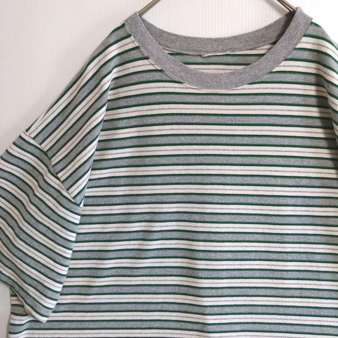 - 806 やや厚手半袖Tシャツ XL 灰 白 緑 ボーダー柄 US古着