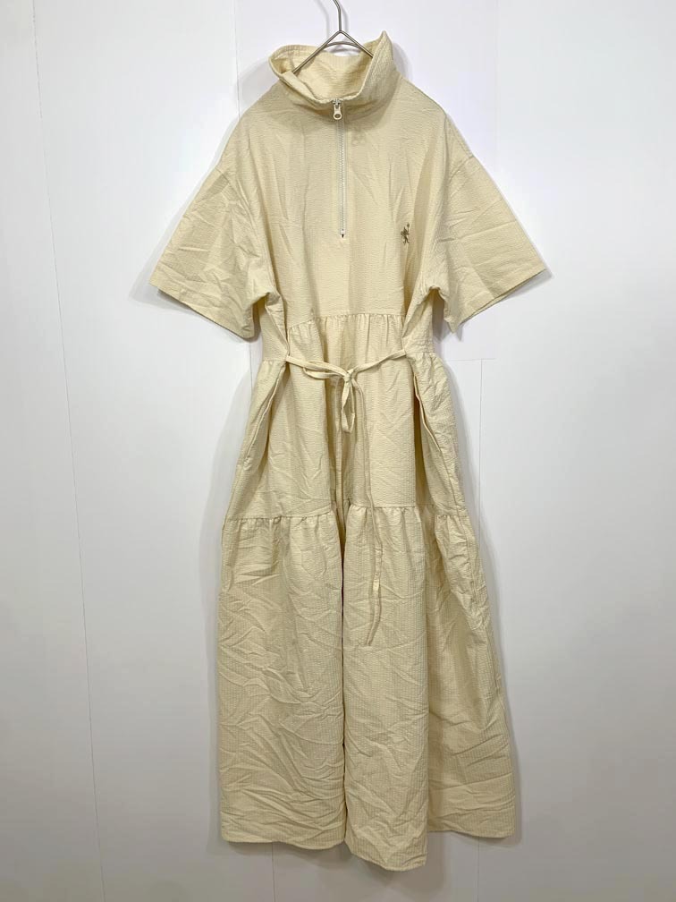 > ゆうパケットOK 美品 classical elf クラシカルエルフ ギャザー サッカー ハーフ ZIP ティアード ワンピース sizeM/アイボリー ■◆