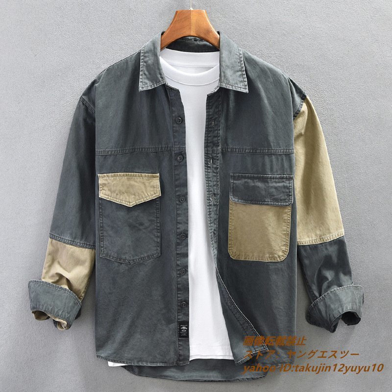 > 長袖シャツ メンズシャツ 切替 ワークシャツ 上質 アウター 個性 ミリタリージャケット ヴィンテージ ジャンバー グレー M