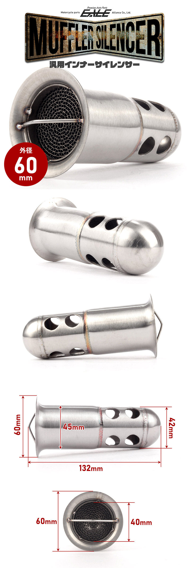 - バイク 汎用 外径60mm 砲弾 ロング 触媒型 マフラー インナーサイレンサー バッフル 消音器 ステンレス 排気音抑制 S-1017