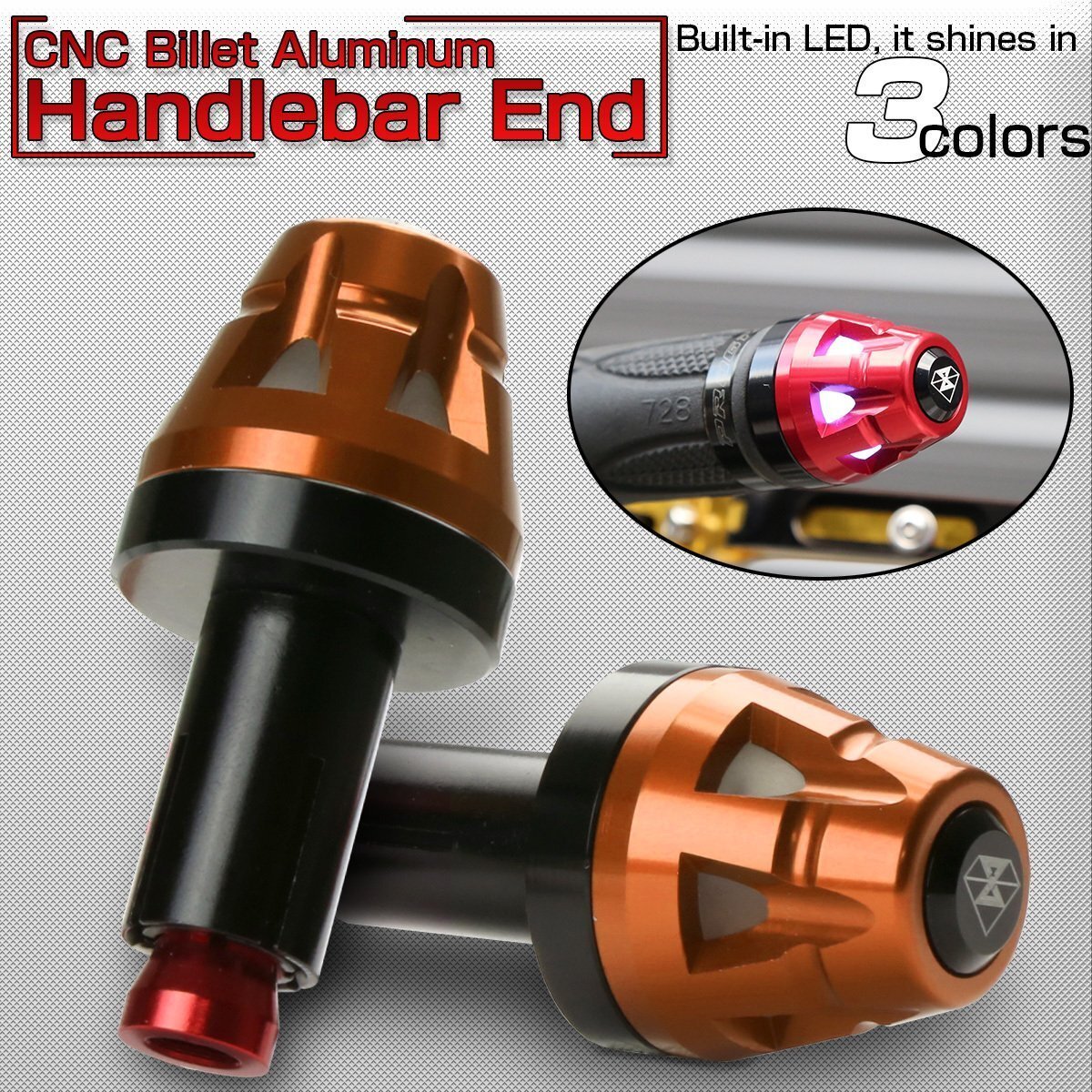 - LED内蔵 CNC アルミビレット バーエンド キャップ オレンジ ハンドル グリップエンド 内径13-20mm 3色発光 F-502-O