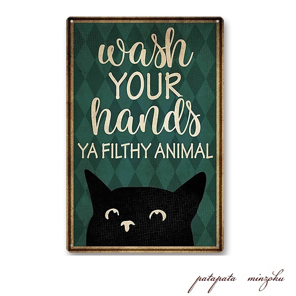 > クロネコ 猫 Wash YOUR Hands メタルプレート ブリキ看板 アンティーク調 ねこ ネコ 黒猫 看板 サインボード 店舗什器