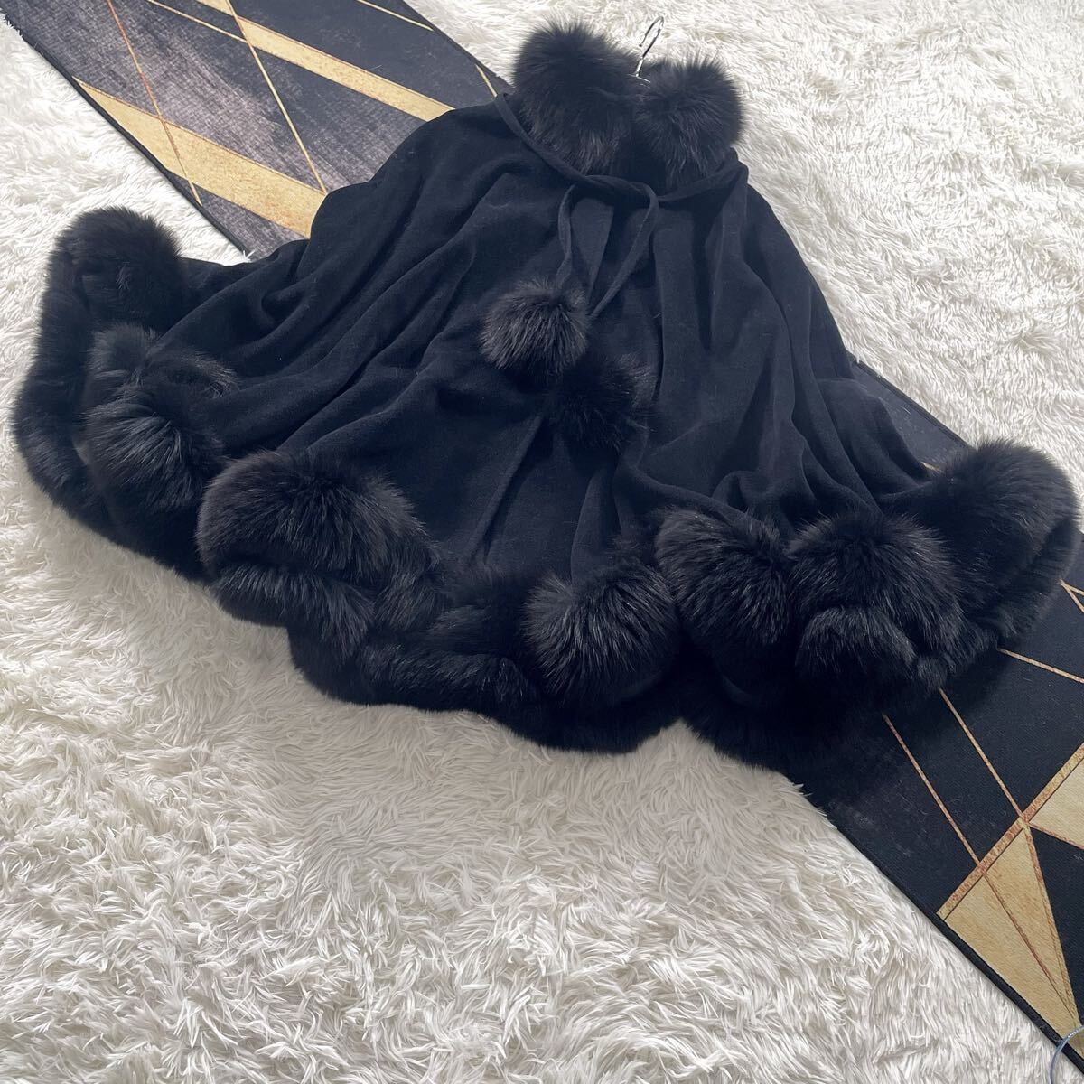 - 極肉厚◎/裾周り310 ブルーフォックス/FOX アンゴラ100% ファーコート ポンチョ リアルファー 毛皮 毛並み ボリューム◎ 青狐 ブラック/黒