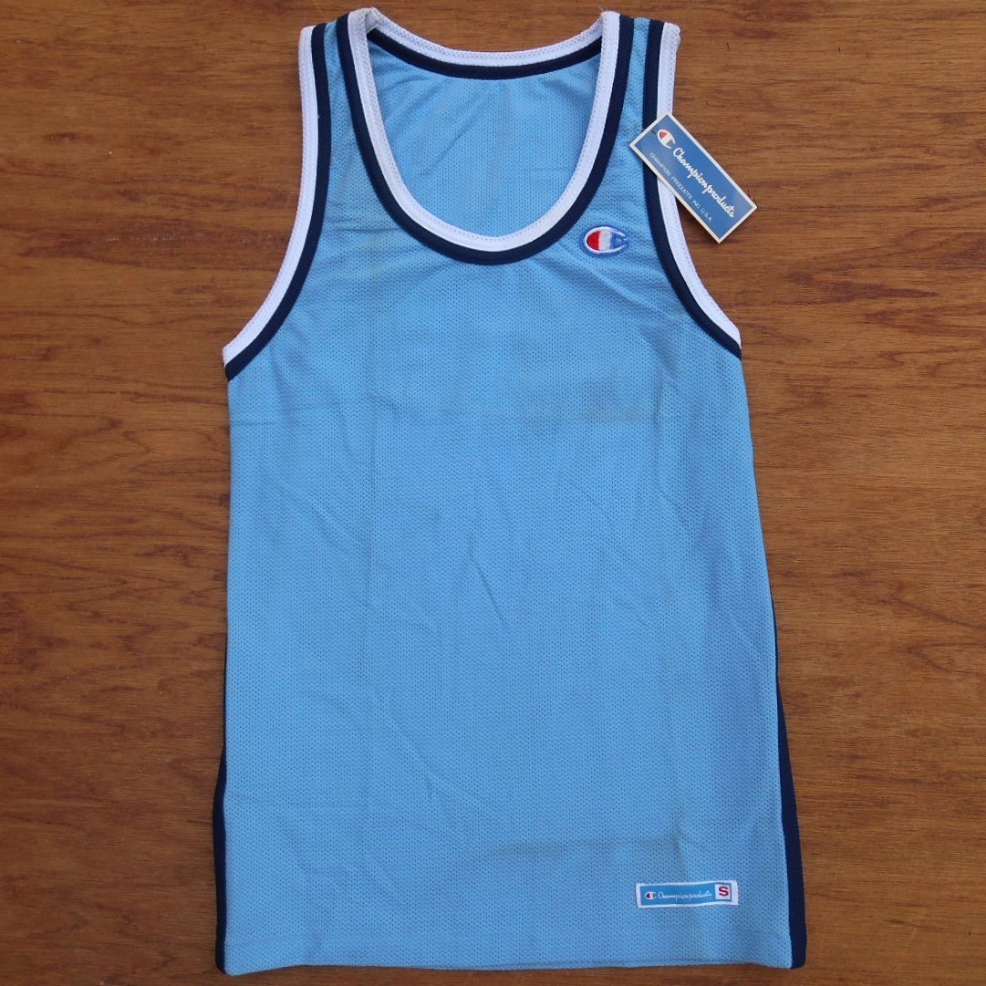 - 未使用 '80s Champion チャンピオン S タンクトップ ナイロン パンチングメッシュ 水色x紺x白 ゴールドウィン デッドストック ヴィンテージ