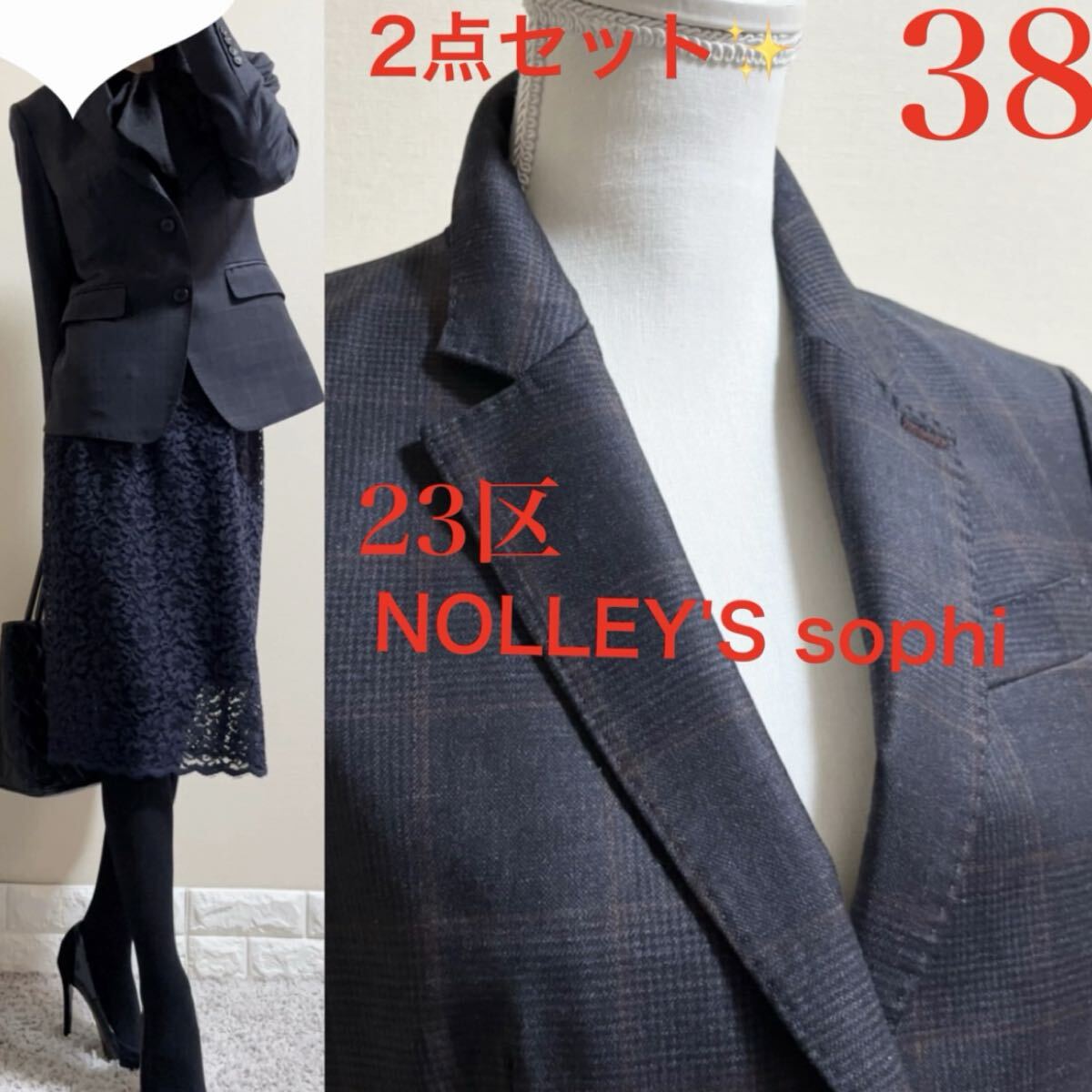> 美品!M スーツ!23区 ニジュウサンク 英国 チェック ジャケット ノーリーズ スカート 濃紺 七五三 入学式 卒業式 通勤 秋冬春