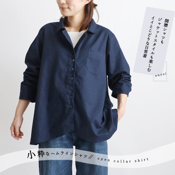 > 秋支度SALE 上質ギマ擬麻コットン 変形ラウンドヘム 裾 シャツ ジャケット 前開き 胸ポケット ゆったり ネイビー 紺 R47B