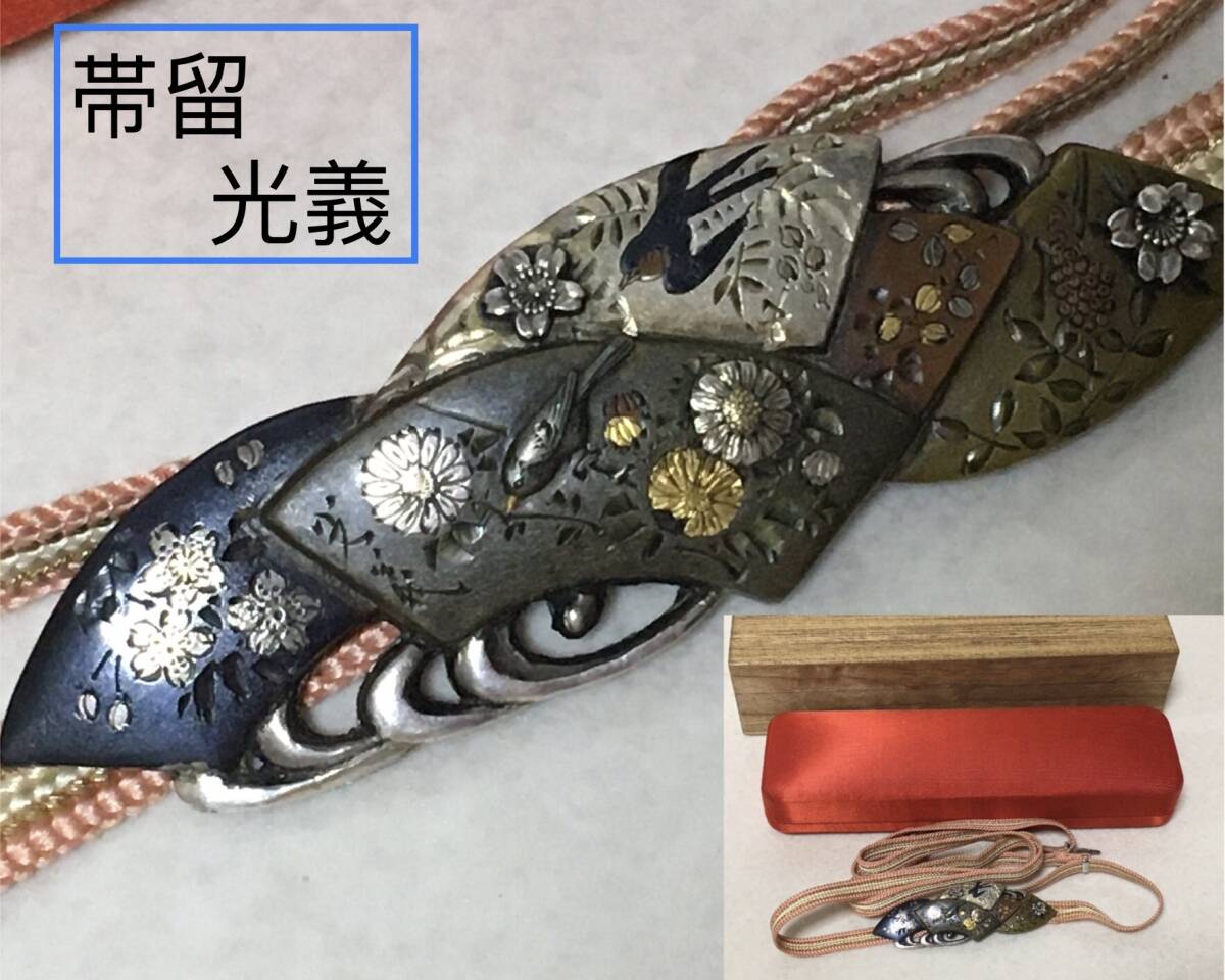 - E573 帯留め 光義 銀地? 四季草花 象嵌 五枚地紙寄せ 彫金 扇面 二重箱 共箱 彫刻