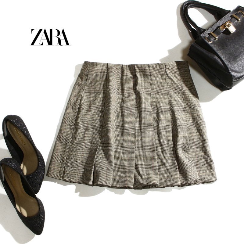 > 美品 ZARA ザラ 秋 合い物 通年 グレンチェック 柄 プリーツスカート ミニスカート XS ブラウン 艶色 ブラック 黒 可愛い