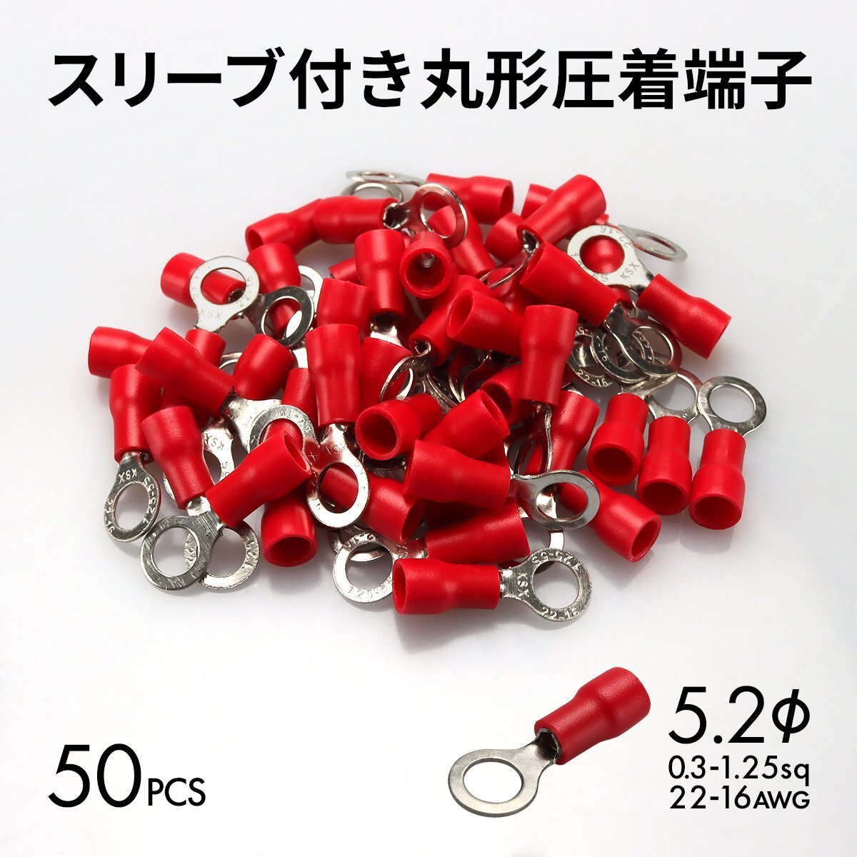 - 丸形圧着端子 スリーブ付き R型 穴径 5.2mm 22-16AWG 50個 IZ174